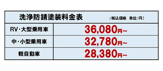 冬は凍結防止剤(塩化ナトリウム等)などの影響で常にサビの危険にさらされています。塩化ナトリウムが下回りに付着すると知らない内に錆が進行し車に大きなダメージを与えてしまいます。大切なお車を錆から守るためには、高圧洗浄+下回りの防錆塗装が不可欠です。